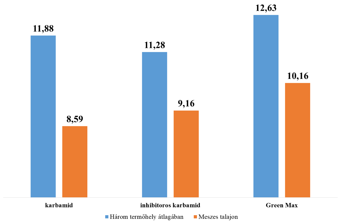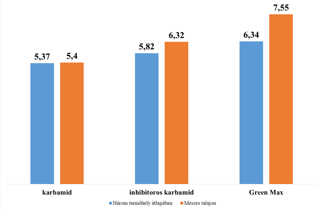 A kukoricában végzett kísérleteink hasonló eredményt hoztak. Itt a Green Max 750 kg/ha-ral adott többet a karbamidhoz képest, és 1350 kg/ha-ral az inhibitoros karbamidhoz képest. Meszes talajon a Green Max 1570 kg/ha-ral adott nagyobb hozamot, mint a karbamid, és kereken 1000 kg/ha-ral nagyobbat, mint az inhibitoros karbamid.