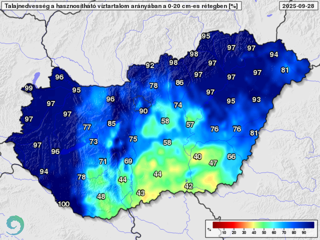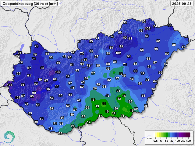A múlt héten fokozatosan következett be az őszies fordulat időjárásunkban. Az ország északnyugati harmadára már kedden megérkezett a lehűlés, a Dunántúl nyugati tájaira a csapadék is, míg az Alföld délkeleti tájain csak csütörtökön esett vissza a hőmérséklet, és eredt el többfelé az eső. A legtöbb eső csütörtökön és pénteken hullott, előbbi napon csaknem országszerte esett valamennyi, majd a hétvégén már csak elszórt záporok fordultak elő, illetve a Dunántúl keleti területein északról déli irányba egy zivatartömb is végig vonult vasárnap. Az elmúlt öt nap csapadékösszegében ismét nagy területi különbségek mutatkoznak, és ezúttal is a déli országrészben esett a legkevesebb, nagy területen mindössze 0-3 mm, míg a Dunántúl nyugati felén és keleti tájain valamint az északkeleti országrészben is többfelé 10-30 mm-t mérhettünk. Hasonló területi mintázatot mutat a harminc napos csapadékösszeg is, az ország jelentős részén 50-100 mm esett, míg az Alföld déli és középső tájain mindössze 10-30 mm, ami 20-50 mm-rel kevesebb, mint a sokéves átlag.