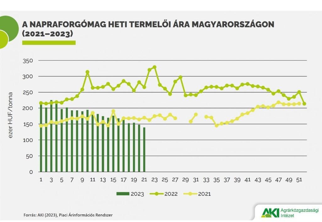 Az AKI PÁIR adatai szerint a magas olajsavtartalmú napraforgómagot (HO) 145,8 ezer (–51 százalék), a nagy olajtartalmú napraforgómagot (LO) 137 ezer forint/tonnáért (–48 százalék) vásárolták a feldolgozók és a kereskedők május utolsó hetében. Az ipari napraforgómag (magas olajsavas napraforgómaggal együtt) áfa és szállítási költség nélküli termelői ára átlagosan 139,5 ezer forint/tonna (–48 százalék) volt.