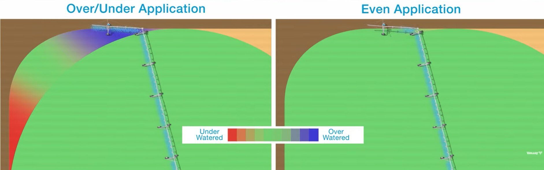 Használja ki a változtatható intenzitású kijuttatásban (VRI) rejlő lehetőségeket EnCompass vezérléssel kombinálva, és szüntesse meg a felesleges területek öntözését! A szórófejenkénti VRI vezérléssel precízebben valósíthatja meg egy heterogén terület öntözését a teljes gép hosszában. Az eltérő öntözési zónák meghatározásához szükséges a terület domborzati térképe és talajtextúrája. A rendelkezésre álló adatok alapján elkészül a VRI recept, amely tartalmazza a zónákhoz rendelt eltérő vízmennyiségeket. A Valley365 távvezérlés segítségével könnyedén feltölthetők az elkészített VRI receptek, ezáltal az alkalmazáson belül bármikor módosíthatók. A szükséges adatok alapján a VRI receptek (shape fájlok) elkészítésében precíziós gazdálkodási szaktanácsadóink segítenek.