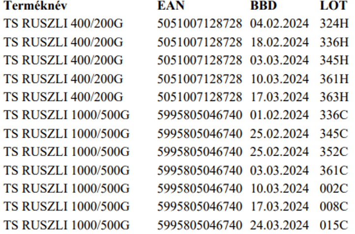 A visszahívott termékek adatai: