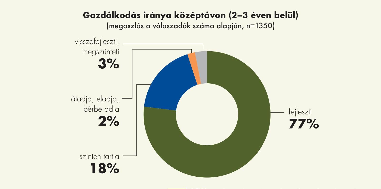 Évről évre megvizsgáljuk a beruházási szándékot és a fejlesztési tervekre is rákérdezünk. A gazdálkodók közel ötöde (18%) tervezi a gazdaság változatlan formában történő fenntartását, 3%-a a gazdaság visszafejlesztését, megszüntetését, 2%-a pedig a gazdaság eladását, átadását, illetve bérbeadását tervezi. A válaszadók 77%-a gondolkodik a gazdaság fejlesztésében 2-3 éven belül. A megkérdezett gazdálkodók 27%-a a gépesítés színvonalát tervezi fejleszteni, míg 13%-a a birtok méretének növelésére helyezi a hangsúlyt. A válaszadók 37%-a a birtok méretének növelése mellett annak technikai, technológiai fejlesztését is célul tűzte ki.