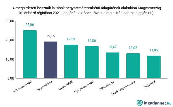A vidéki használtlakás-piacot tekintve elmondható, hogy átlagosan csaknem 20%-kal nőtt a négyzetméterenkénti átlagár 10 hónap leforgása alatt. A régiók közül a legnagyobb mértékben Közép-Dunántúlon nőtt a használt lakások négyzetméterenkénti ára, az elmúlt 10 hónap alatt több, mint 25%-kal. Emellett kiugró áremelkedést az északi régiókban tapasztalhatunk – az agglomerációban 19,15%, míg az Észak-Alföldön csaknem 18% körüli emelkedést mutatnak a friss statisztikák. A legkisebb mértékben a Dél-Alföldön drágult a használt lakások négyzetmétere, itt megközelítőleg 12% a regisztrált áremelkedés.