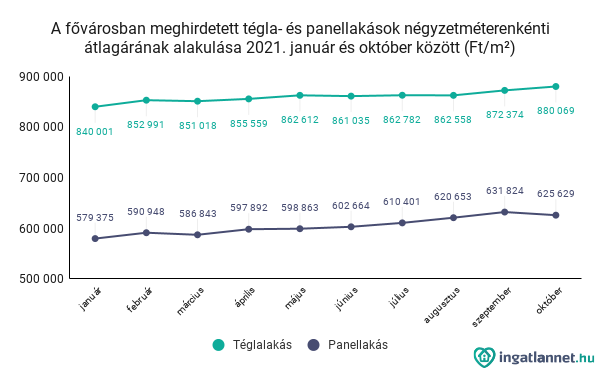 Az idei év további részében a használt lakásoknál az ingatlanpiaci előrejelzéseket is túlszárnyaló drágulás vette kezdetét. Az áremelkedés az ingatlannet.hu aktuális statisztikái szerint októberre meghaladta a 10%-ot országos szinten. A használt téglalakások négyzetméterenkénti átlagára 14%-kal, míg a panellakásoké csaknem 8%-kal nőtt a januárban rögzített adatokhoz mérten.