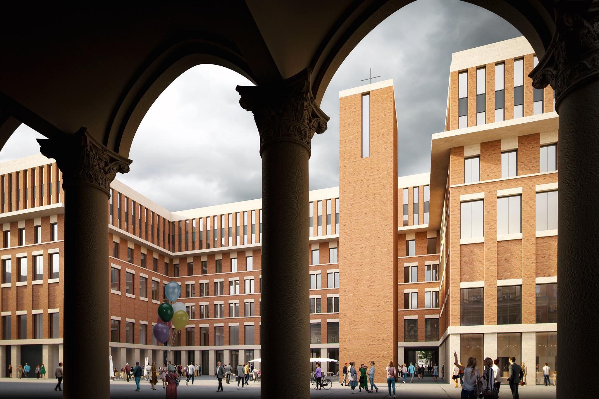 Vizuálisan a hasonló szín- és anyaghasználatnak köszönhetően, fizikailag pedig egy, a történelmi olasz városok hangulatát idéző térrel, „piazza"-val. A tér súlyponti helyén egy különálló torony áll kereszttel a tetején, amely kiemelkedik a tetőtájból, és világosan kijelöli a Pázmány helyét a belvárosban.