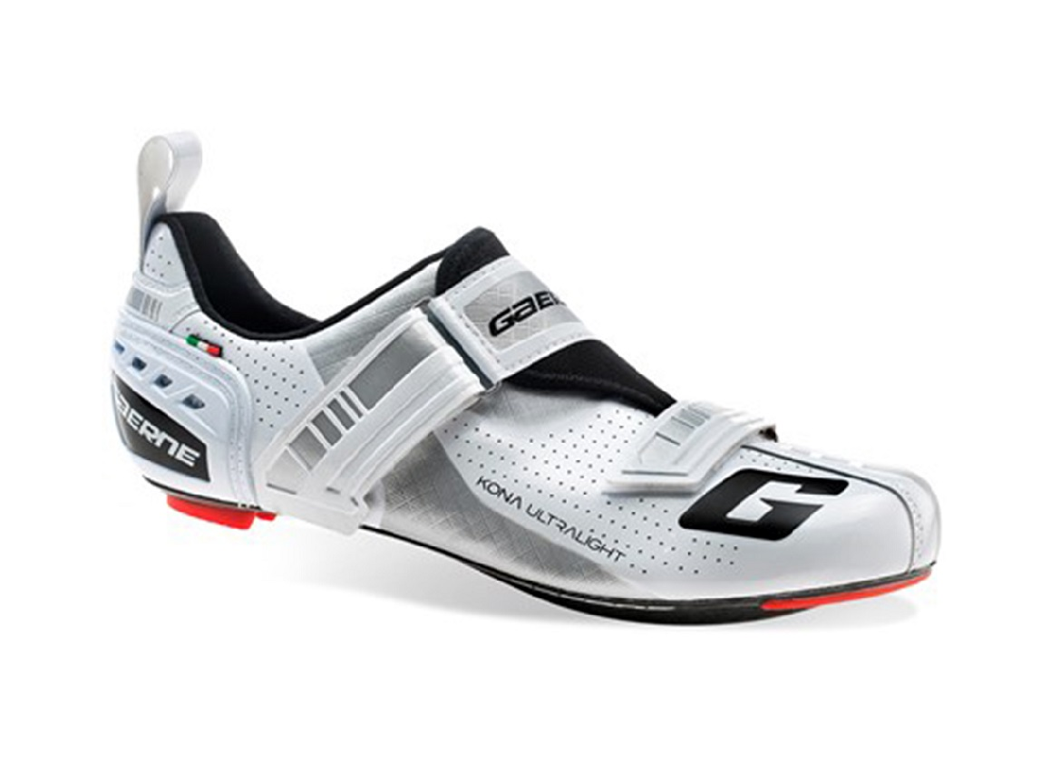 A Gaerne Kona egy ízig-vérig profi triatlon kerékpáros cipő, tépőzáras kompozit talppal, természetesen magán viselve a hamisítatlan olasz precizitást. Csúszásgátlóval ellátott, kifejezetten komfortos, mindössze 279 grammos lábbeliről van szó, ami minden triatlonos kaland során hozza a tőle elvárt minőséget.