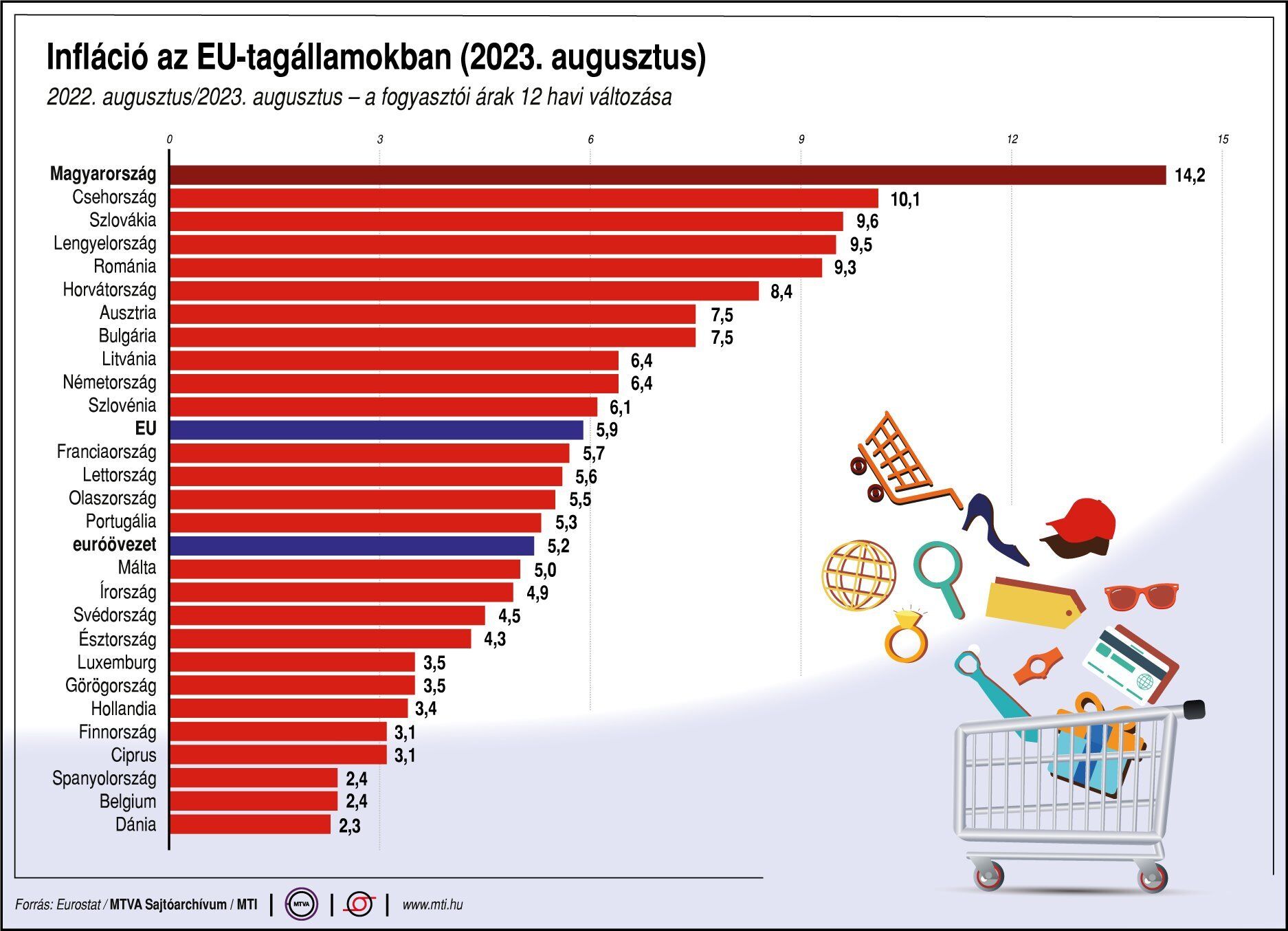Az Európai Unió 27 tagállamában 5,9 százalékra csökkent az infláció augusztusban a júliusi 6,1 százalékról. Tavaly augusztusban 10,1 százalék volt az infláció az EU-ban.